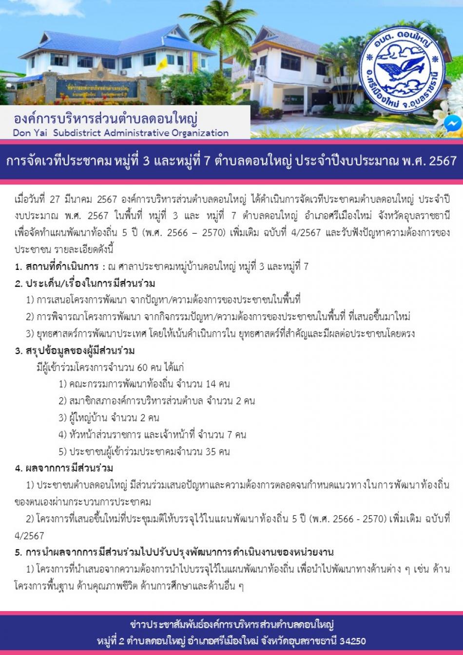 การจัดเวทีประชาคม หมู่ที่ 3 และหมู่ที่ 7 ตำบดอนใหญ่ ประจำปีงบประมาณ พ.ศ. 2567 [29 มีนาคม 2567]