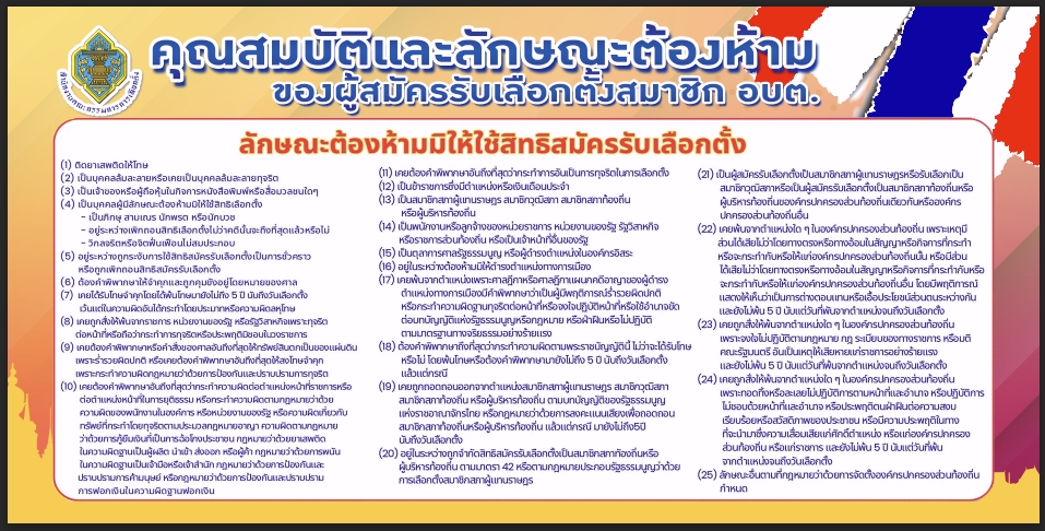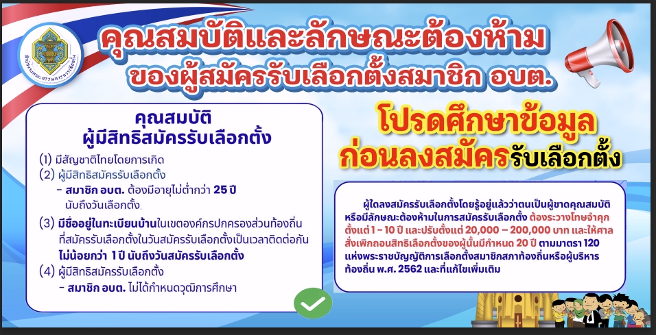 ชื่อเรื่อง : ประชาสัมพันธ์คุณสมบัติและลักษณะต้องห้ามของผู้สมัครรับเลือกตั้งสมาชิกสภาองค์การบริหารส่วนตำบลและนายกองค์การบริหารส่วนตำบล